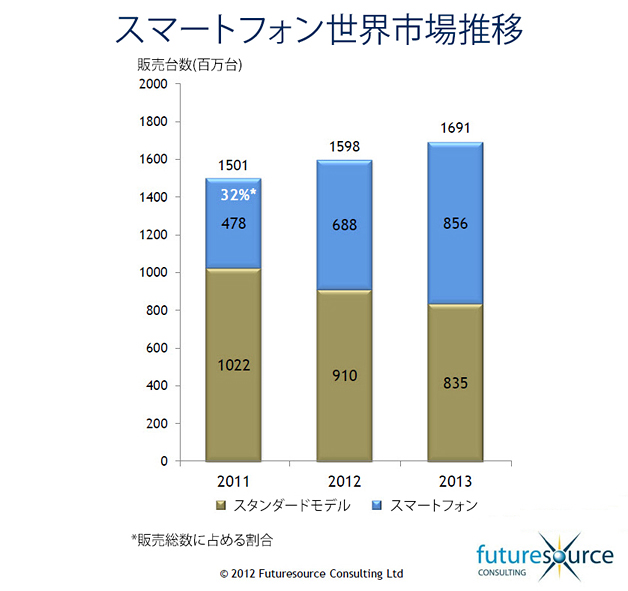 スマートフォンのグローバル出荷総額は2011年に1000億ドルを超えたが、2012年には30%の更なる伸びが期待されており、TV市場を抜き最大の家電金額シェアとなる勢いである(白物家電除く)。