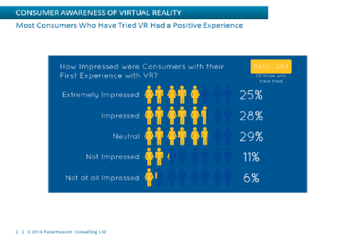 「現在消費者意識は比較的新しい技術には良好であるが、その道のりは長く、特に重要な16歳から35歳の人口層により意識づけが必要です。大げさのようですが、わずか3%の消費者しかVRを試したことがないことは大きな問題です」とFuturesource ConsultingのシニアアナリストAdam Coxはコメントした。「人々を大量のお金を使うよう説得するにはさらに大きな高まりが必要だということです。人々は購入するかもしれない物を理解する必要があるのです。それができるのは最大限のマーケティングではない。皆さんはVRを体験する必要があるのです。VRはこの業界全体に莫大な利益をもたらすチャンスを作り出す可能性を秘めています。もし消費者がこの技術に目を向けることなく、またそれを試してみる機会がなければそれは失敗するでしょう」