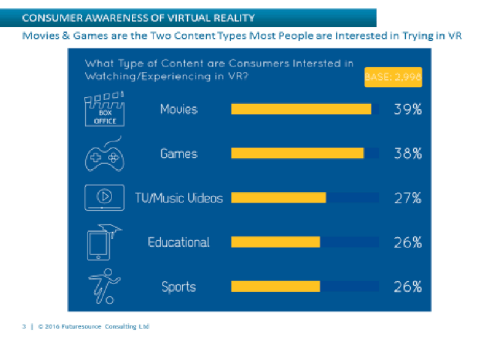 人々がVR体験に最も関心のあるコンテンツに関しては、Futuresourceの調査によると、映画やゲームである。それらがコンテンツリストの中で最も高く、サンプル消費者の39%がVRの映画体験に興味があった。一方38%がVRゲームに興味があった。